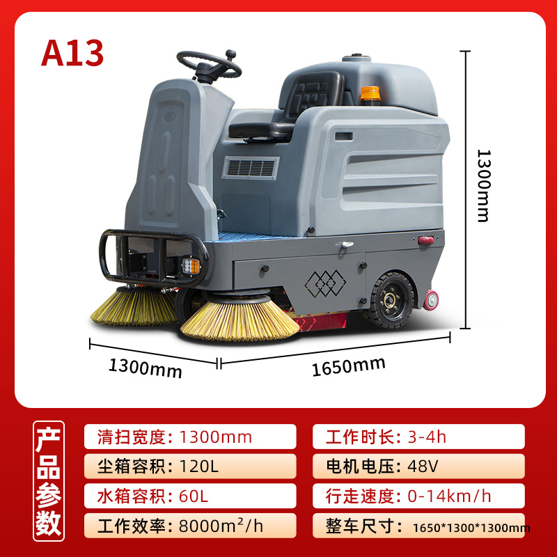 LT-A13型,小型敞篷驾驶式扫地车,清扫宽度1250mm,工作时间2-3小时,工作效率:3000-5000㎡/h,采用的是大品牌铅酸免维护电池。应用场景:工厂车间的过道、小区内较窄的道路、学校、公园等清洁面积在3000平米以内的场地。